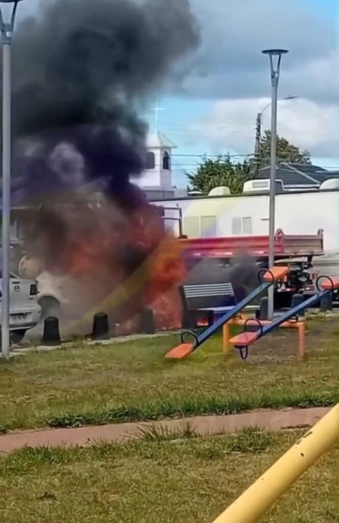 De forma paralela, personal de Carabineros se hizo presente en el sitio del suceso para adoptar el procedimiento de rigor, regular el tránsito y recopilar los antecedentes necesarios para determinar las responsabilidades del accidente que originó el fuego.