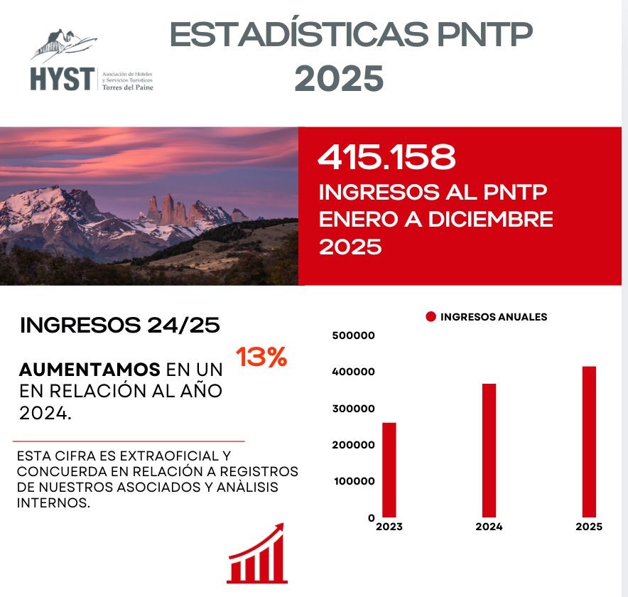 La Asociación de Hoteles y Servicios Turísticos de Torres del Paine (HYST) informa que, hace una semana, recibió las cifras oficiales de ingreso correspondientes al año 2025, remitidas por la Corporación Nacional Forestal (CONAF) desde su nivel nacional.
