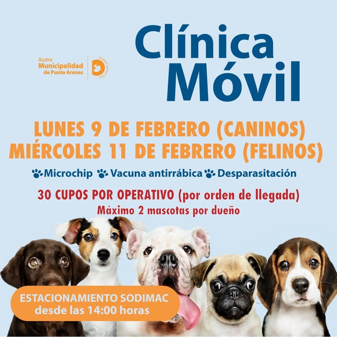 Una buena noticia para las y los vecinos de Punta Arenas. La Municipalidad realizará un nuevo operativo de Clínica Móvil, pensado especialmente para apoyar el cuidado y la salud de nuestras mascotas.