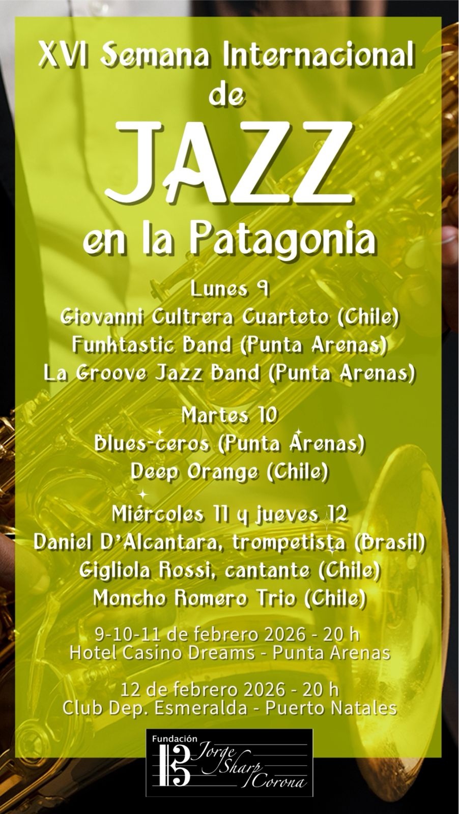 Jorge Sharp Galetovic de la Fundación Jorge Sharp Corona, organizadores del evento indica que el festival destaca este año por una programación que equilibra el talento regional con figuras legendarias del circuito nacional. «En la casa siempre hubo piano, guitarra y batería, una familia de músicos, subrayando que el jazz, lejos de ser un género de nicho, busca conquistar al público magallánico a través del formato en vivo.