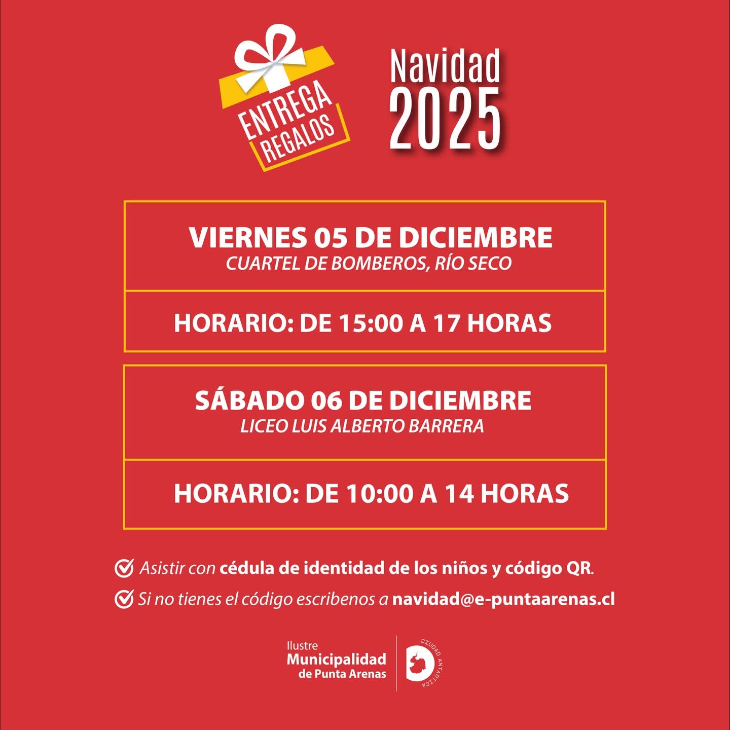 馃巵 Punta Arenas. La Municipalidad confirm贸 que la entrega de regalos para los ni帽os y ni帽as inscritos en la Navidad Municipal 2025 se realizar谩 el viernes 5 y s谩bado 6 de diciembre.