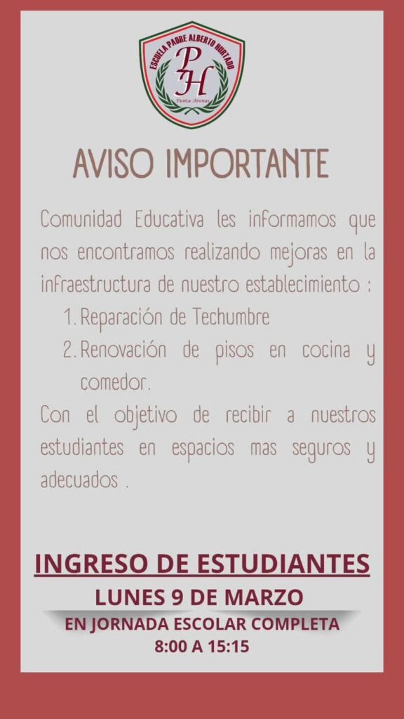 Asimismo, se informó que el ingreso de los estudiantes está programado para el lunes 9 de marzo, en jornada escolar completa, desde las 8:00 hasta las 15:15 horas.
