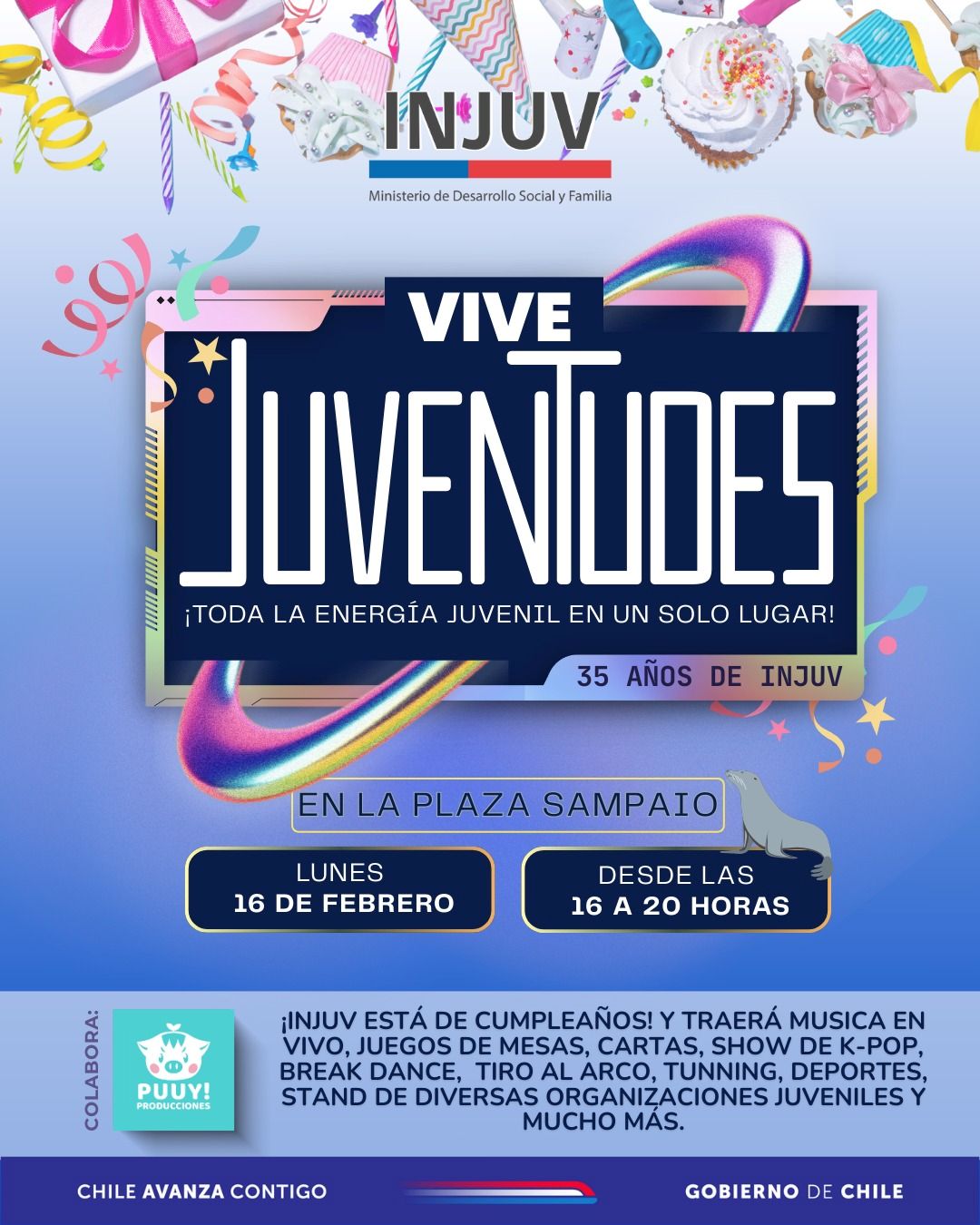 El Instituto Nacional de la Juventud (INJUV) realizará el próximo lunes 16 de febrero una jornada abierta a la comunidad denominada “Vive Juventudes”, en el marco de la conmemoración de su 35° aniversario.