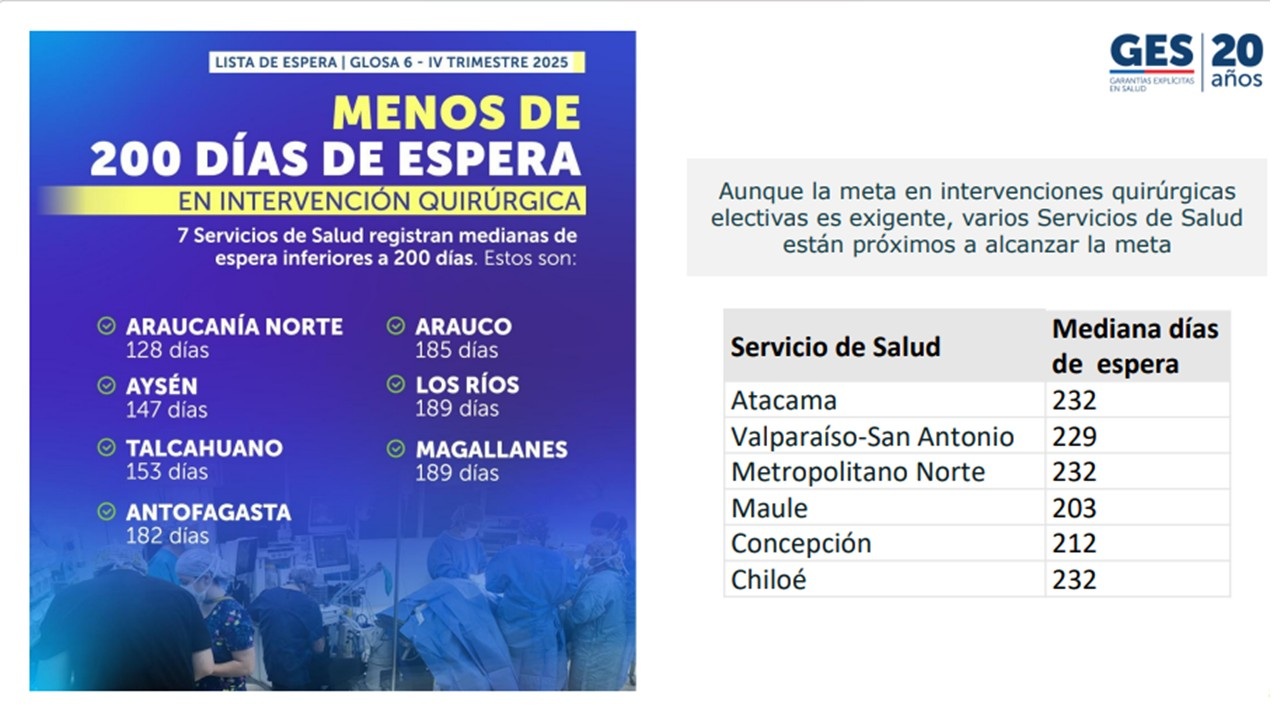 De acuerdo a Informe Glosa N°6 Ley de Presupuestos 2025 de la Subsecretaría de Redes Asistenciales, durante el año 2025, las medianas de espera alcanzaron su nivel más bajo desde la creación del sistema de registro de listas de espera a nivel país, registrándose en Magallanes un significativo avance, especialmente en lo que respecta a Intervenciones Quirúrgicas, llegando a una median de 189 días.