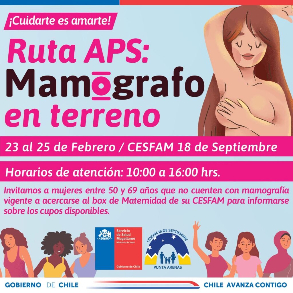 Con el objetivo de reforzar la detección precoz del cáncer de mama, el Servicio de Salud Magallanes anunció el despliegue de la Ruta APS: Mamógrafo en Terreno, iniciativa que se desarrollará entre el 23 y el 25 de febrero en el CESFAM 18 de Septiembre, en la comuna de Punta Arenas.