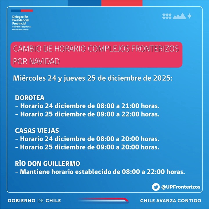 Los pasos fronterizos de la provincia de Ultima Esperanza tendrán modificación en sus horarios de atención debido a la festividad navideña.