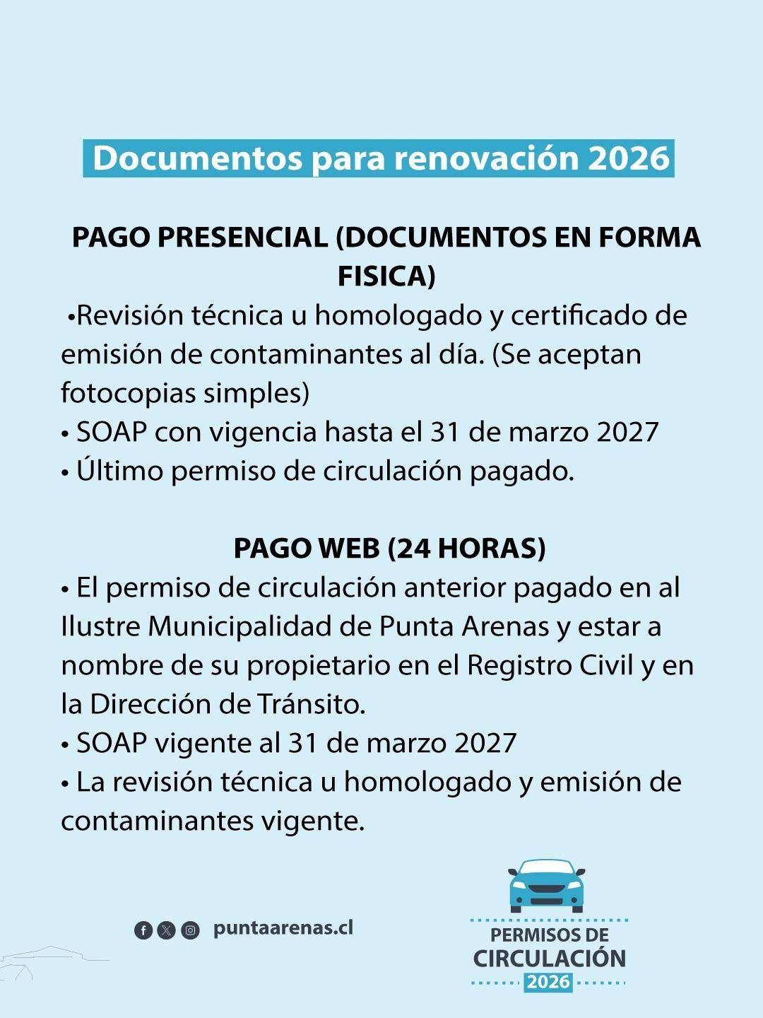 En tanto, para quienes prefieran realizar el pago online, se exige que el permiso de circulación anterior haya sido cancelado en la Municipalidad de Punta Arenas y que el vehículo esté inscrito a nombre de su propietario tanto en el Registro Civil como en la Dirección de Tránsito. Además, se debe contar con el SOAP vigente hasta el 31 de marzo de 2027 y la revisión técnica u homologado junto al certificado de emisiones al día.
