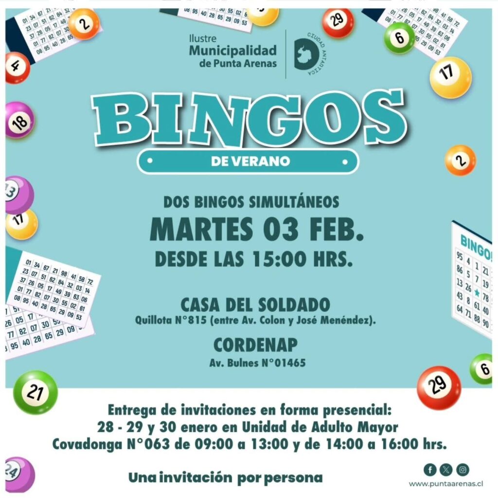 La Ilustre Municipalidad de Punta Arenas anunció la realización de los tradicionales Bingos de Verano, una actividad recreativa dirigida a las personas mayores de la comuna, que se desarrollará el martes 3 de febrero, a partir de las 15:00 horas.
