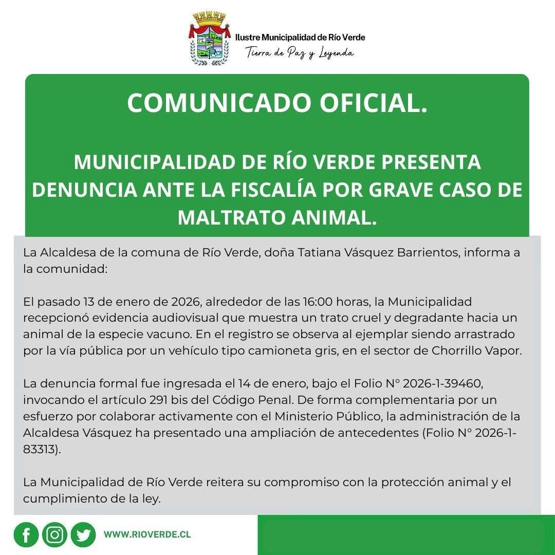 La Municipalidad de Río Verde ingresó una denuncia formal ante el Ministerio Público por un grave caso de maltrato animal, luego de recibir evidencia audiovisual que da cuenta de un trato cruel hacia un animal de la especie bovina en la comuna.