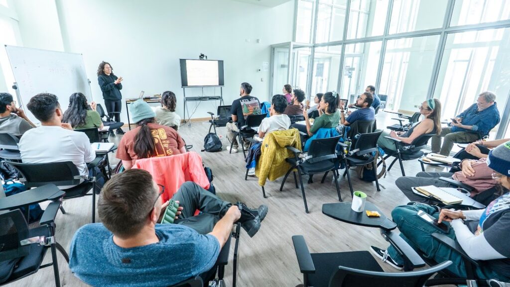 La experta en aves playeras, trabajó de la mano con las y los estudiantes del curso, enseñándoles acerca de estas especies, como son sus largos viajes desde un hemisferio al otro, además de técnicas de captura y la utilización de GPS o radiotransmisores con tecnología MOTUS, cuya una de sus antenas se encuentra presente en el edificio del CHIC.