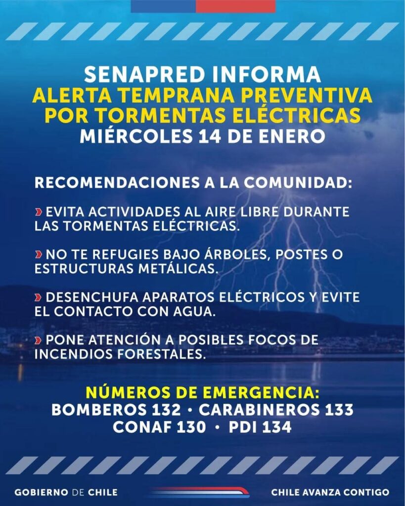 El Servicio Nacional de Prevención y Respuesta ante Desastres (SENAPRED) informó la declaración de una Alerta Temprana Preventiva por tormentas eléctricas, la que se mantendrá vigente durante la jornada del miércoles 14 de enero, con el objetivo de reforzar las medidas de prevención y resguardar la seguridad de la población.