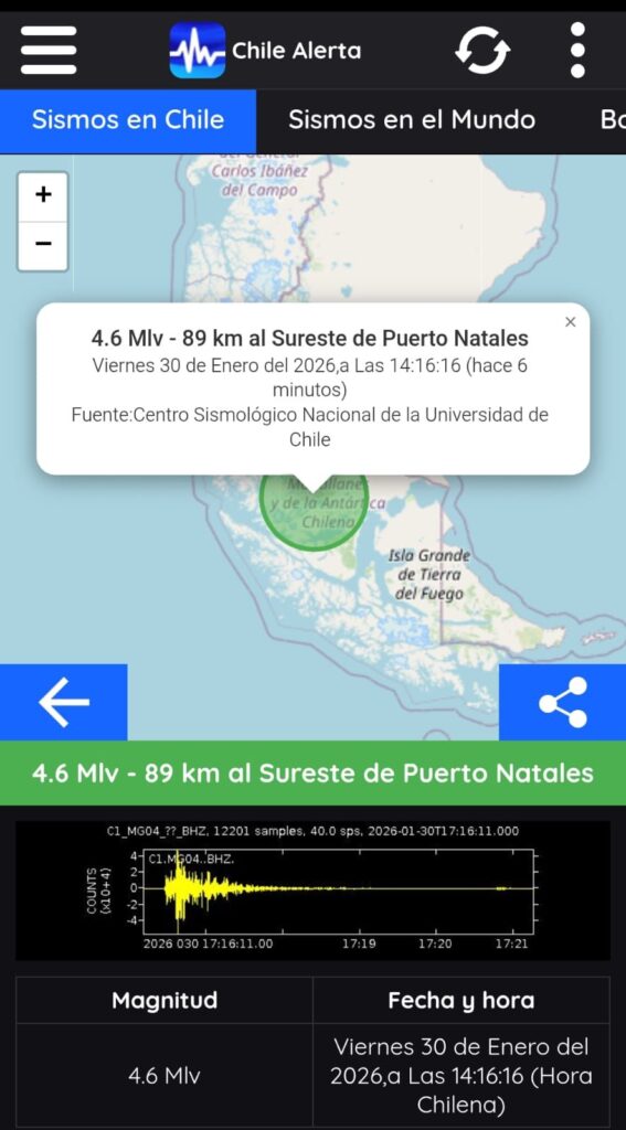 Un sismo de magnitud 4,6 se registró la tarde de este viernes 30 de enero en la Región de Magallanes y de la Antártica Chilena, específicamente a 89 kilómetros al sureste de la comuna de Puerto Natales.